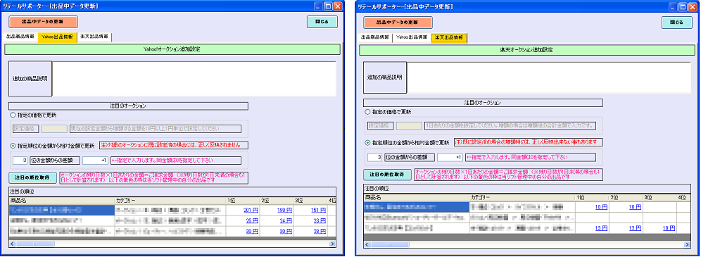 1.ヤフオク・楽天オークションで出品中商品の入札状況を表示