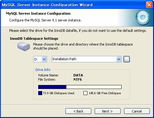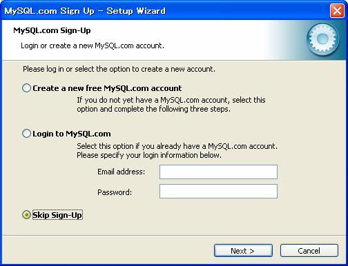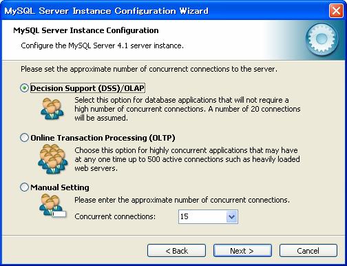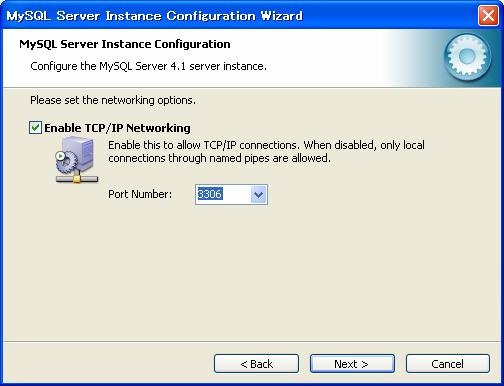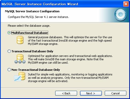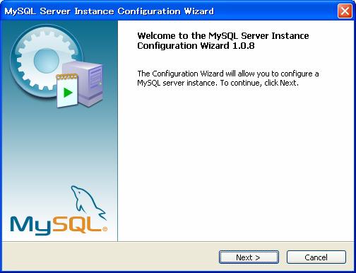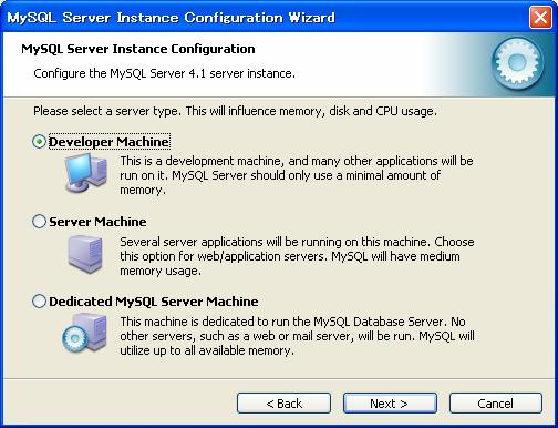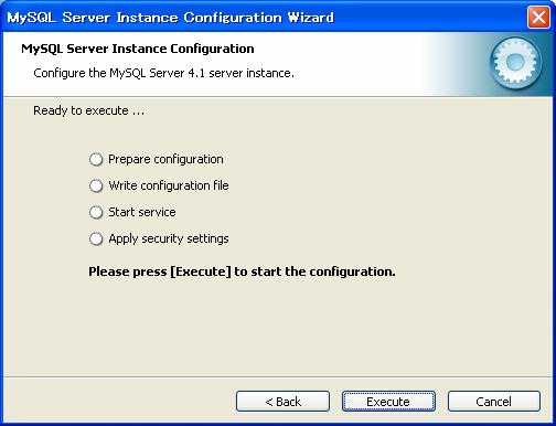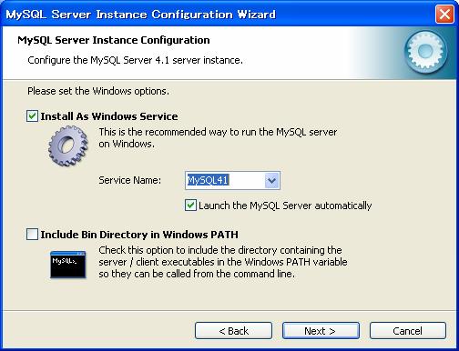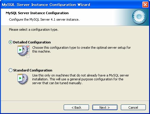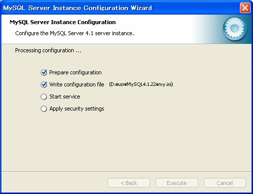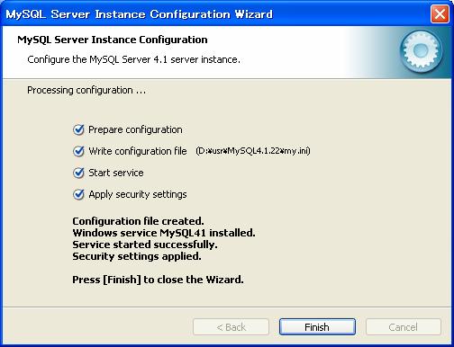 スタートメニューから「MySQL」−「My SQL Server4.1」−「MySQL Server Instance Config Wizard」をクリック