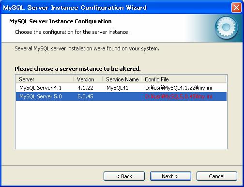 今回インストールしたMy SQL Server5.0を選択しNextボタンをクリック