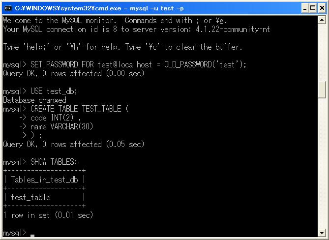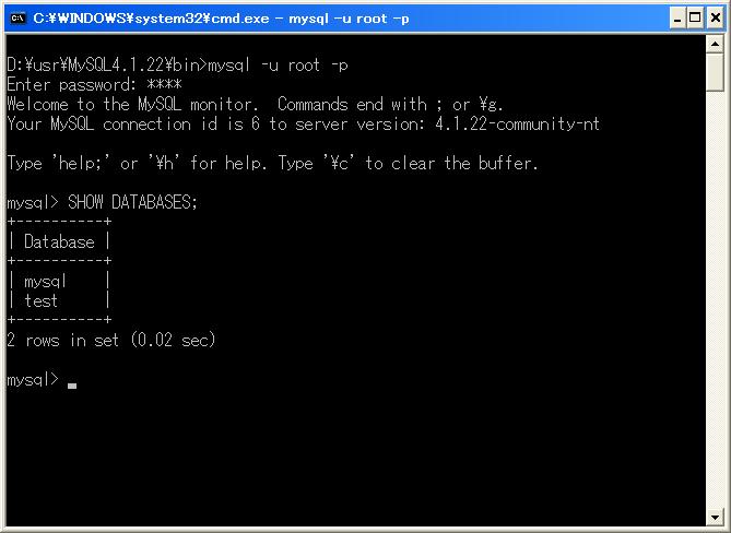 MySQL 4.1.22の初期状態では、「mysql」と「test」があるのがわかる。