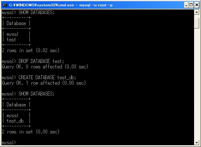 これで、デフォルトのtestというデータベースを削除し、自分用のデータベースを作成しました。