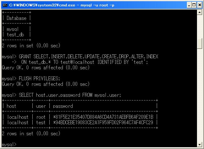 GRANT SELECT,INSERT,DELETE,UPDATE,CREATE,DROP,ALTER,INDEX ON test_db.* TO test@localhost IDENTIFIED BY 'test';