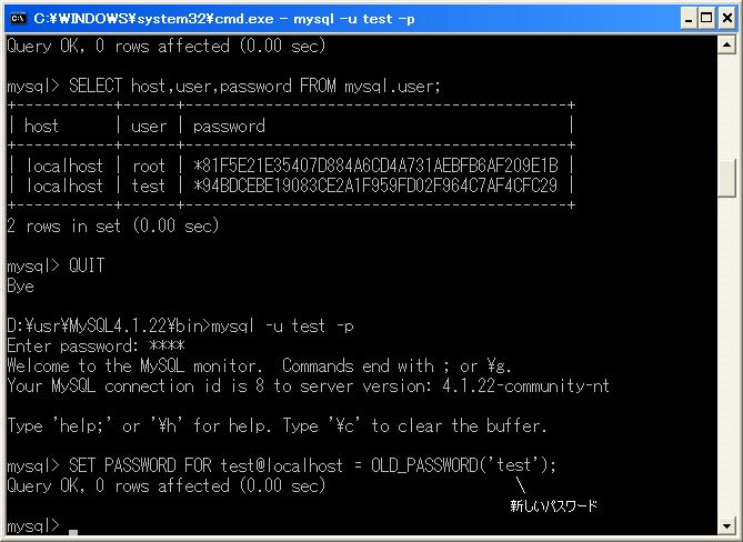 SET PASSWORD FOR ユーザID@接続先のホスト名 = OLD_PASSWORD('旧パスワード');