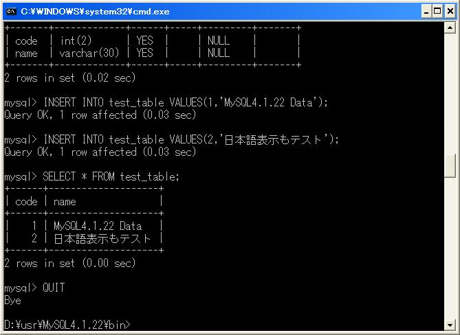 INSERT INTO test_table VALUES(1,'MySQL4.1.22 Data');