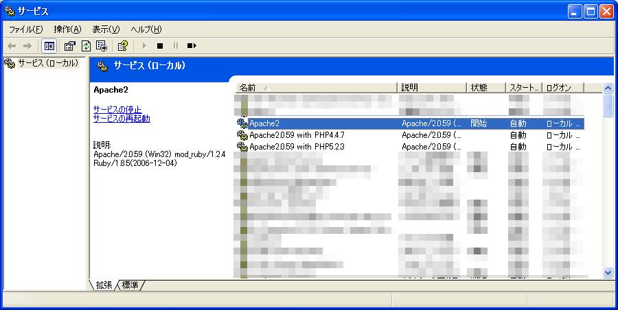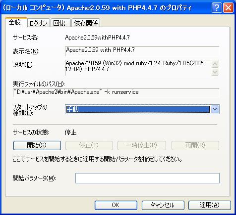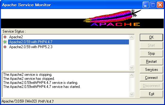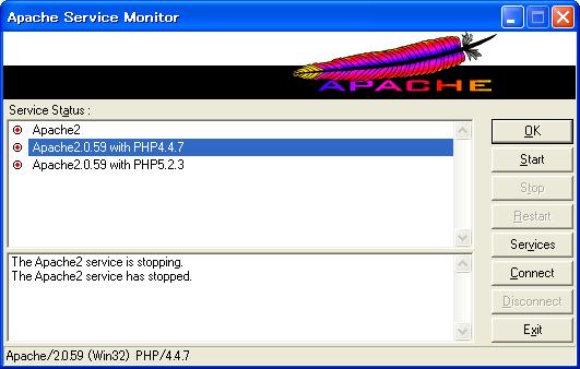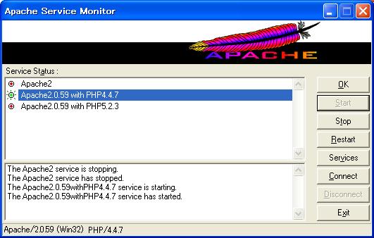 Apache Service Monitor から、Apache2.0.59 with PHP4.4.7を開始する