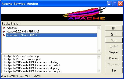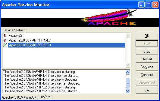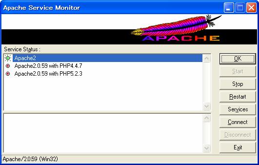 Apache Service Monitor から、Apache2.0.59 with PHP5.2.3を開始する